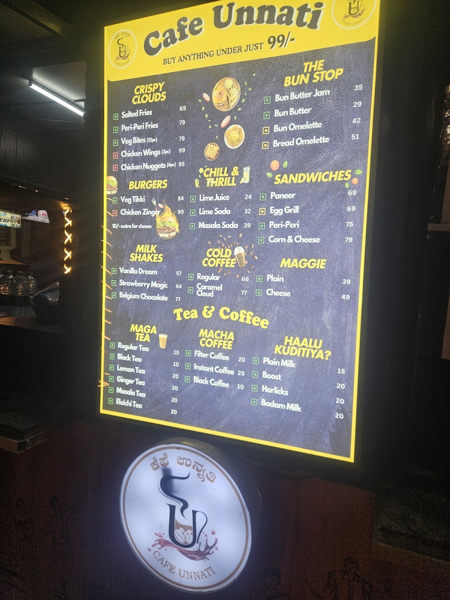 Overall, Cafe Unnati is not just a place to grab a quick meal but a destination to enjoy flavorful food, great coffee, and to relax with friends. With its affordable pricing and a menu that invites adventure, this cafe promises an experience that's both satisfying and memorable. Don’t miss out on their exceptional Chai and the must-try Kadapa Karam Dosa, highlighted by customers as a delightful experience!